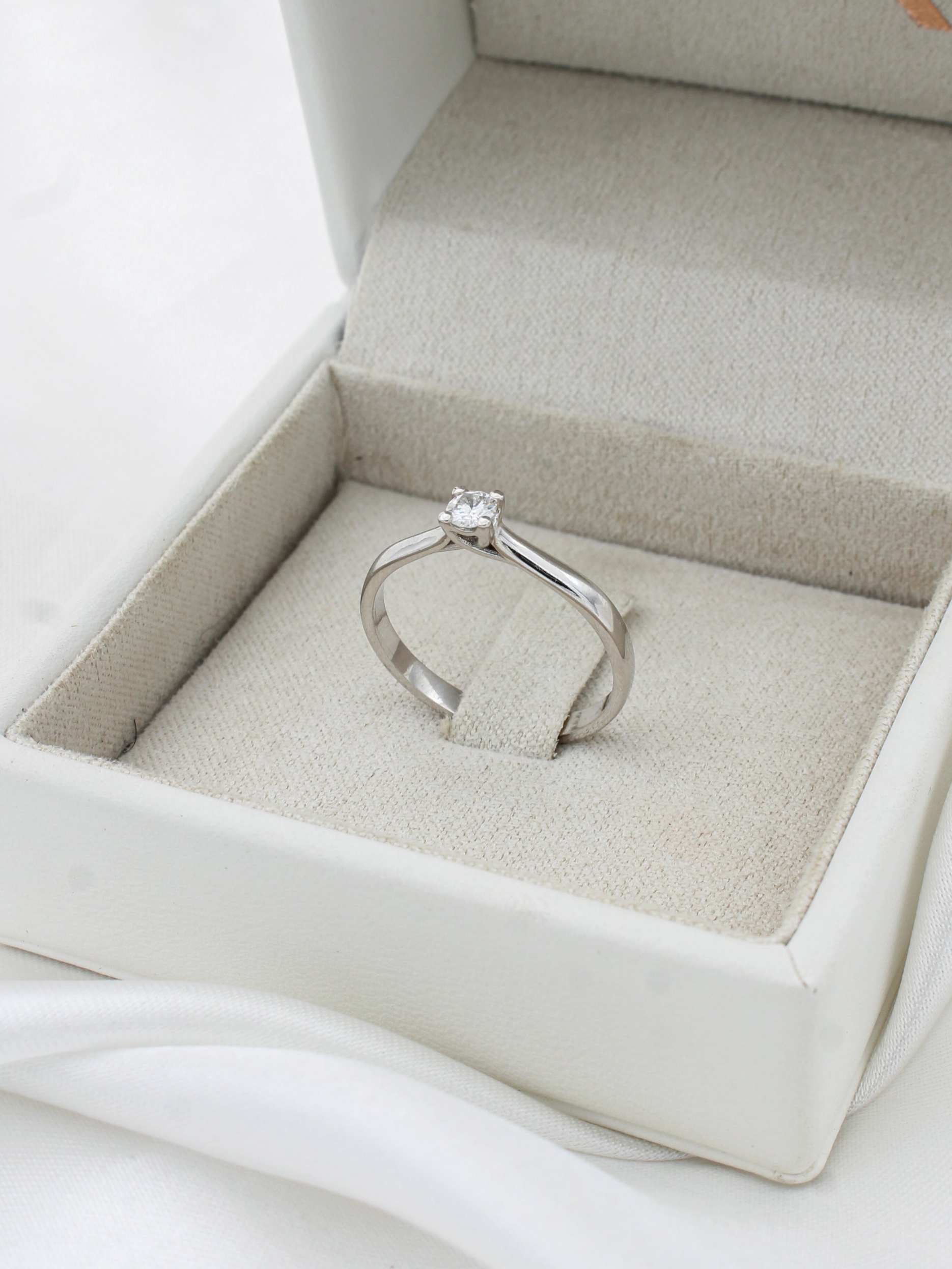 Anillo de compromiso solitario macizo elaborado a mano en Oro Blanco de Primera Ley 18Kt 750 milésimas con diamante natural talla brillante de 0,18ct.