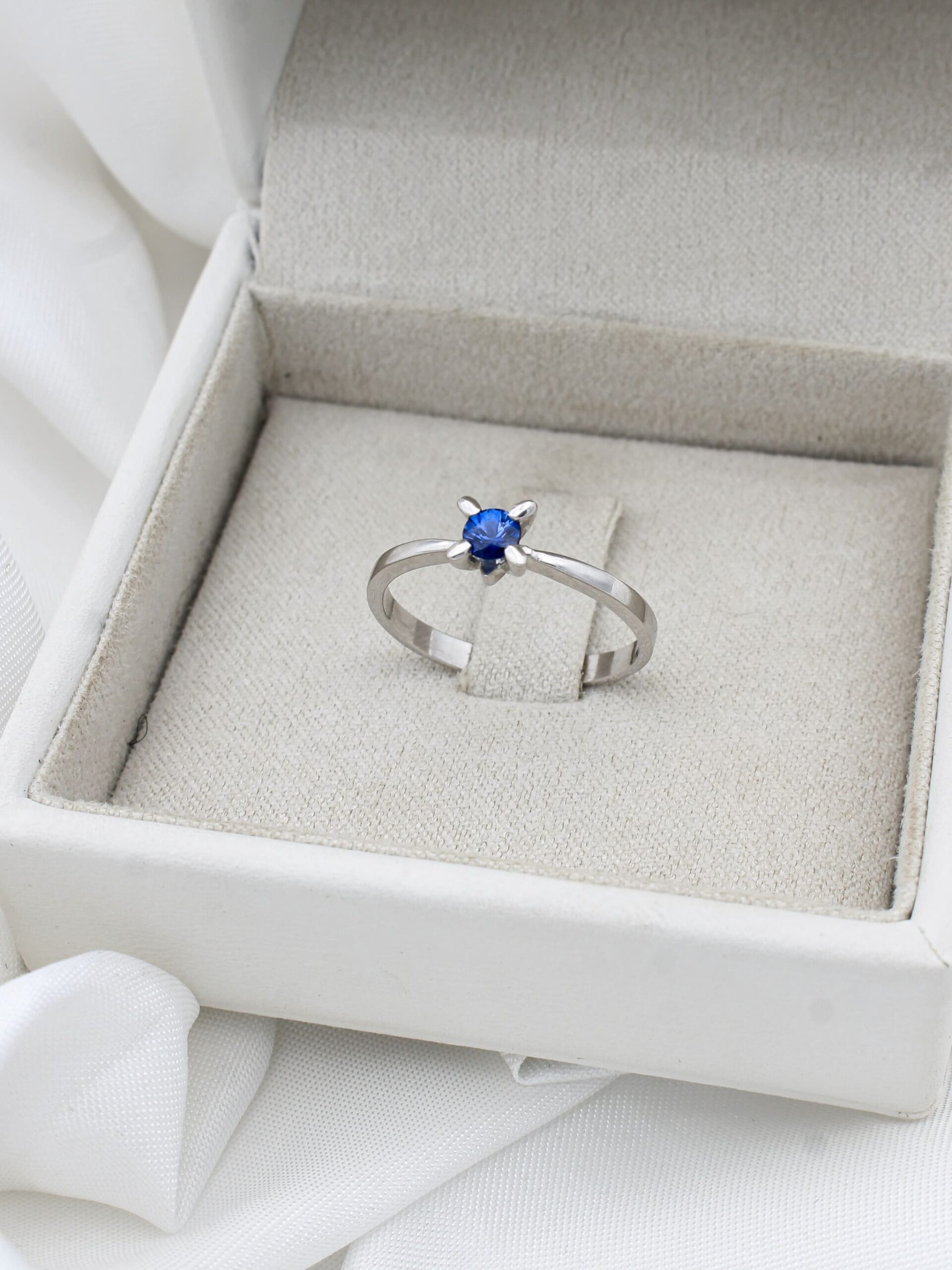 Anillo de compromiso solitario macizo elaborado a mano en Oro Blanco de Primera Ley 18Kt 750 milésimas con Esmeralda natural talla brillante de 0,22ct.
