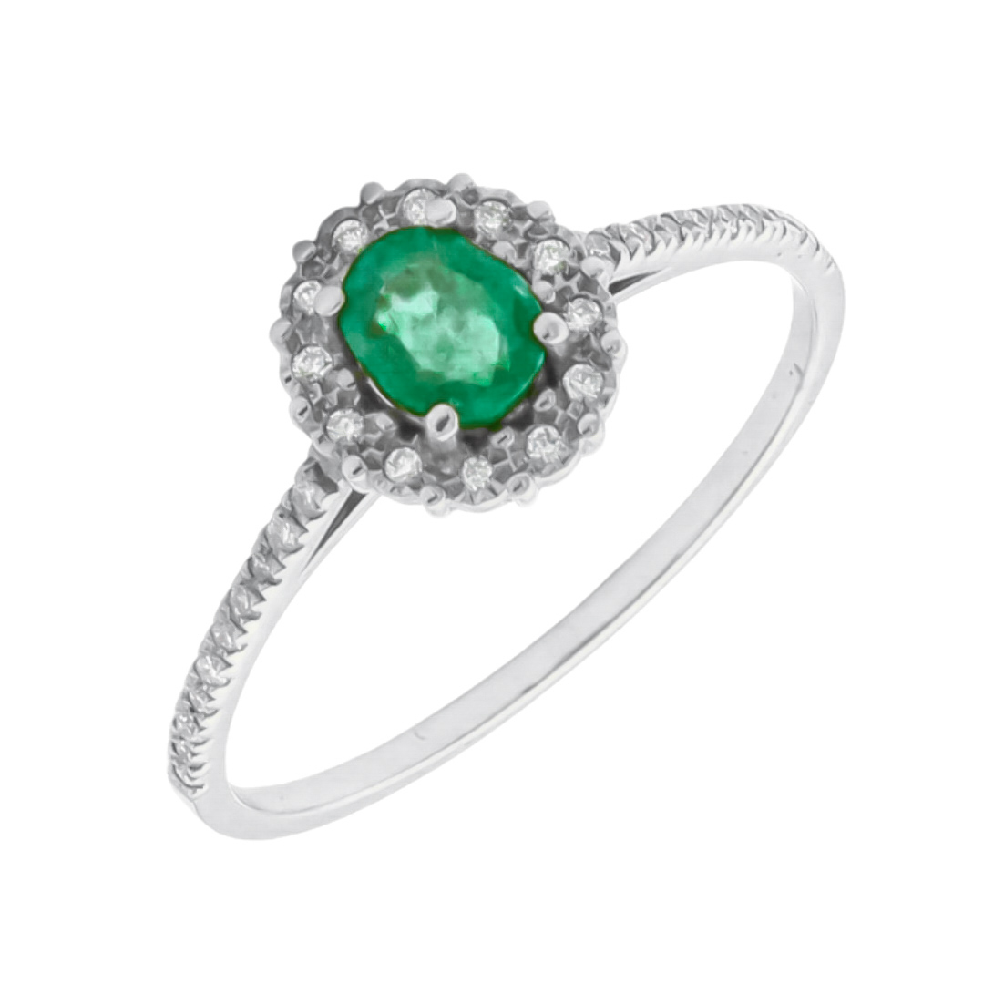 Anillo rosetón acompañado elaborado a mano en Oro de Primera Ley 18Kt 750 milésimas con diamantes naturales talla brillante y esmeralda oval natural