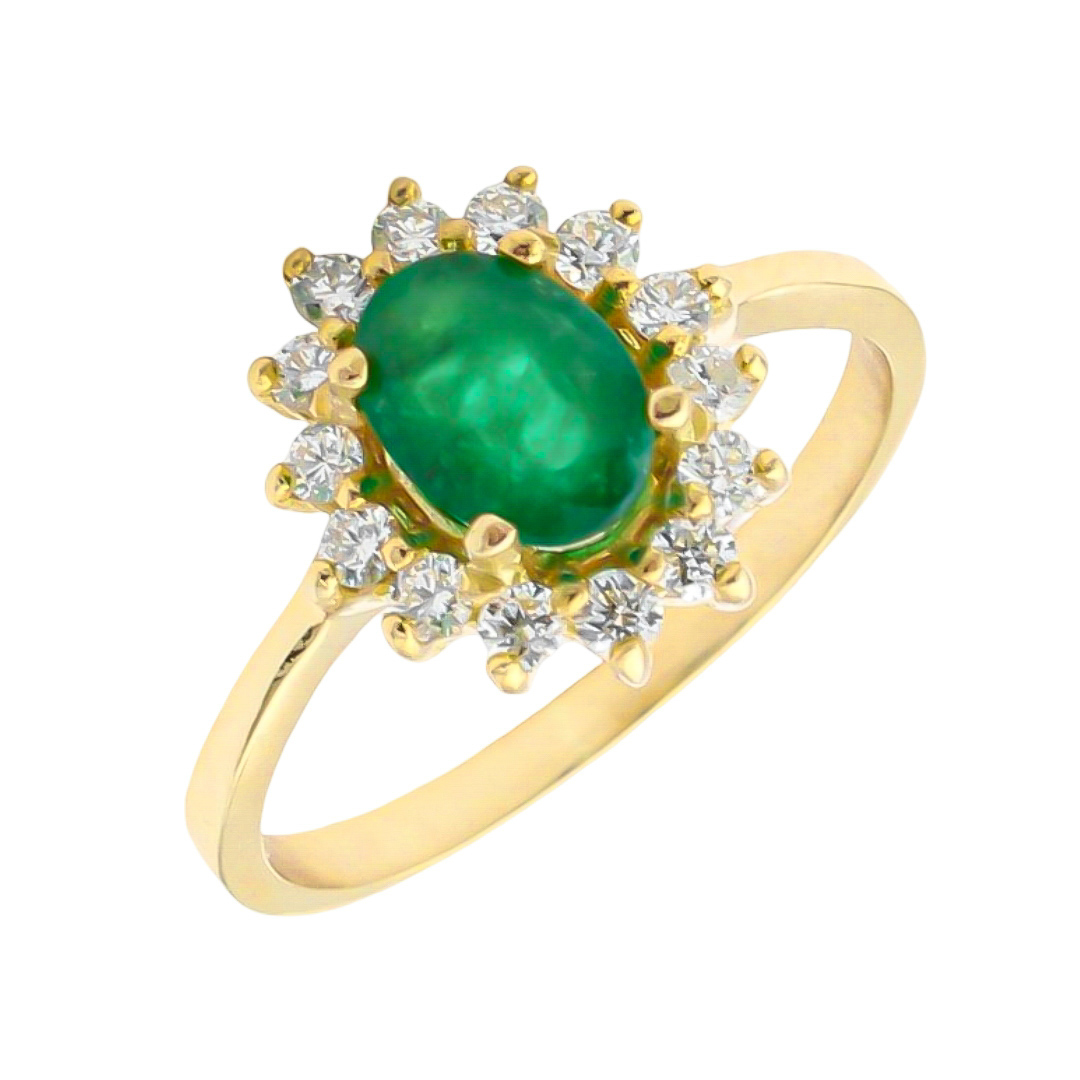 Anillo rosetón elaborado a mano en Oro de Primera Ley 18Kt 750 milésimas con diamantes naturales talla brillante y esmeralda oval natural
