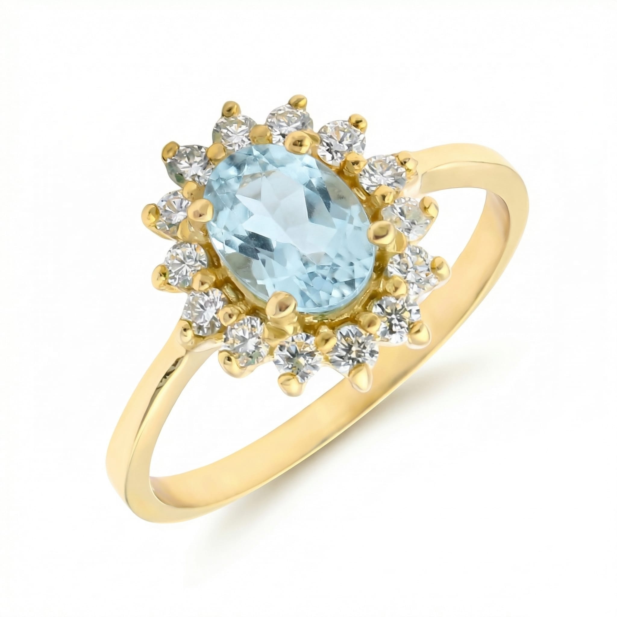 Anillo rosetón elaborado a mano en Oro de Primera Ley 18Kt 750 milésimas con diamantes naturales talla brillante y Aguamarina oval natural