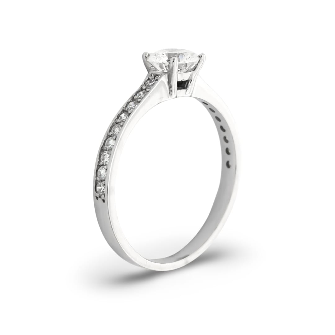 Anillo de compromiso elaborado a mano en Oro Blanco de Primera Ley 18Kt 750 milésimas con diamantes naturales talla brillante haciendo un total de 0,72ct.