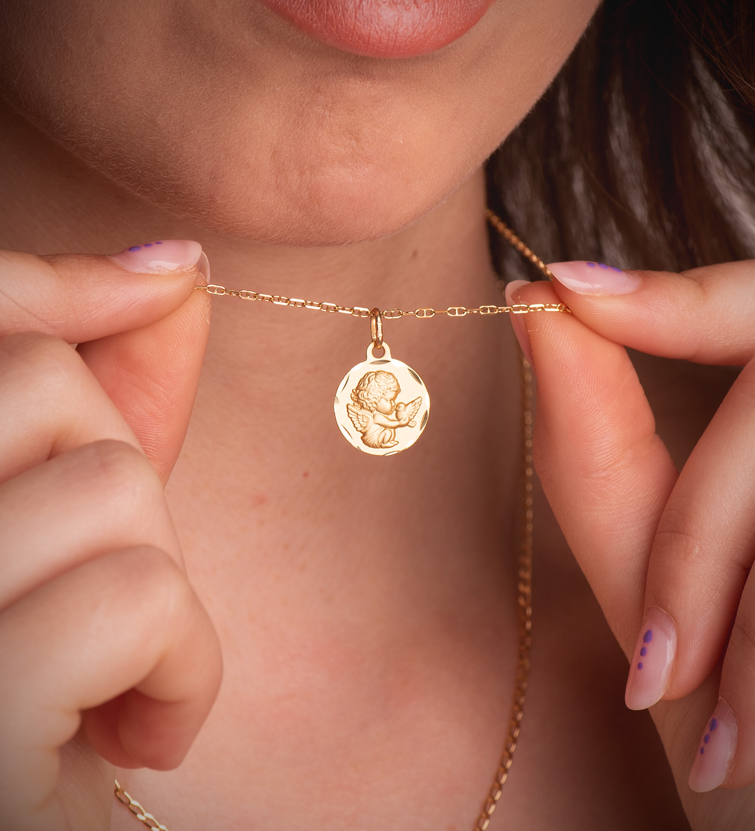 Medalla ángel, elaborada en Oro Primera Ley 18Kt 750 milésimas.
