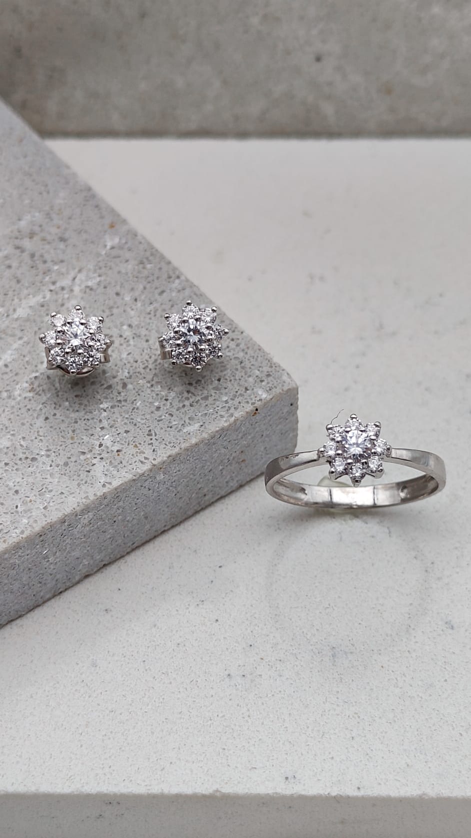 Pendientes rosetón elaborados en Oro Blanco de Primera Ley 18Kt 750 milésimas con diamantes naturales talla brillante haciendo un total de 0,60ct.