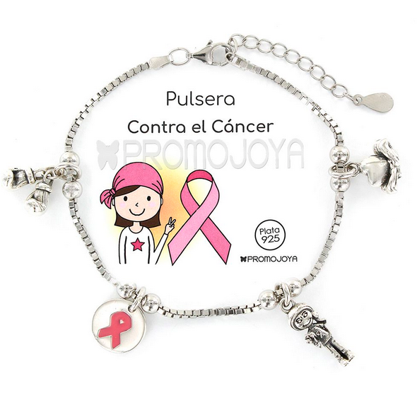 Pulsera Contra el Cáncer, elaborada en Plata de Primera Ley 925 milésimas con baño de rodio. Es una pulsera maciza tipo veneciana con colgantes característicos.