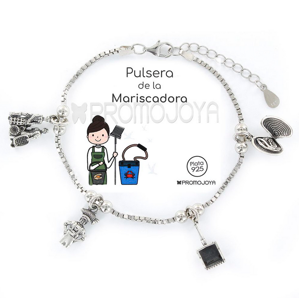 Pulsera de la Mariscadora, elaborada en Plata de Primera Ley 925 milésimas con baño de rodio. Es una pulsera maciza tipo veneciana con colgantes característicos de la profesión.